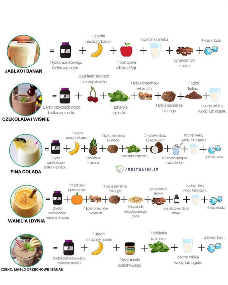 Na powyższej liście znajdują się składniki i elementy, które warto uwzględnić przy przygotowywaniu białkowych koktajli.
